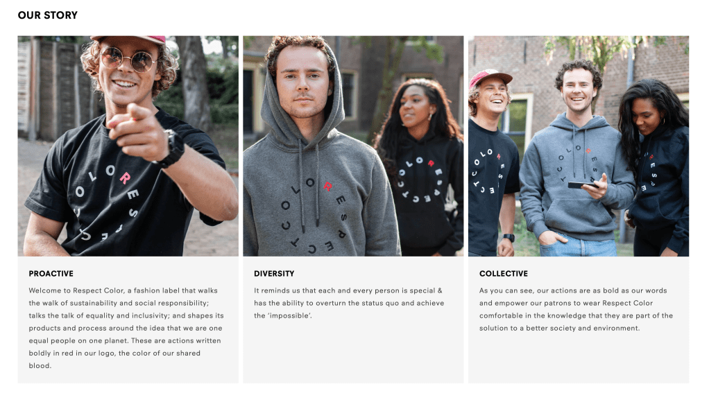 I was approached by startup fashion brand Respect Color to write their brand story and create a copy style that would reflect their ethical approach to sustainable fashion and advocacy.